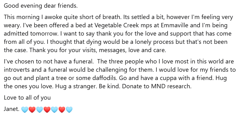 In her last Facebook post, Janet said she was having trouble breathing and that she was being admitted to the hospice where she had planned to have VAD.